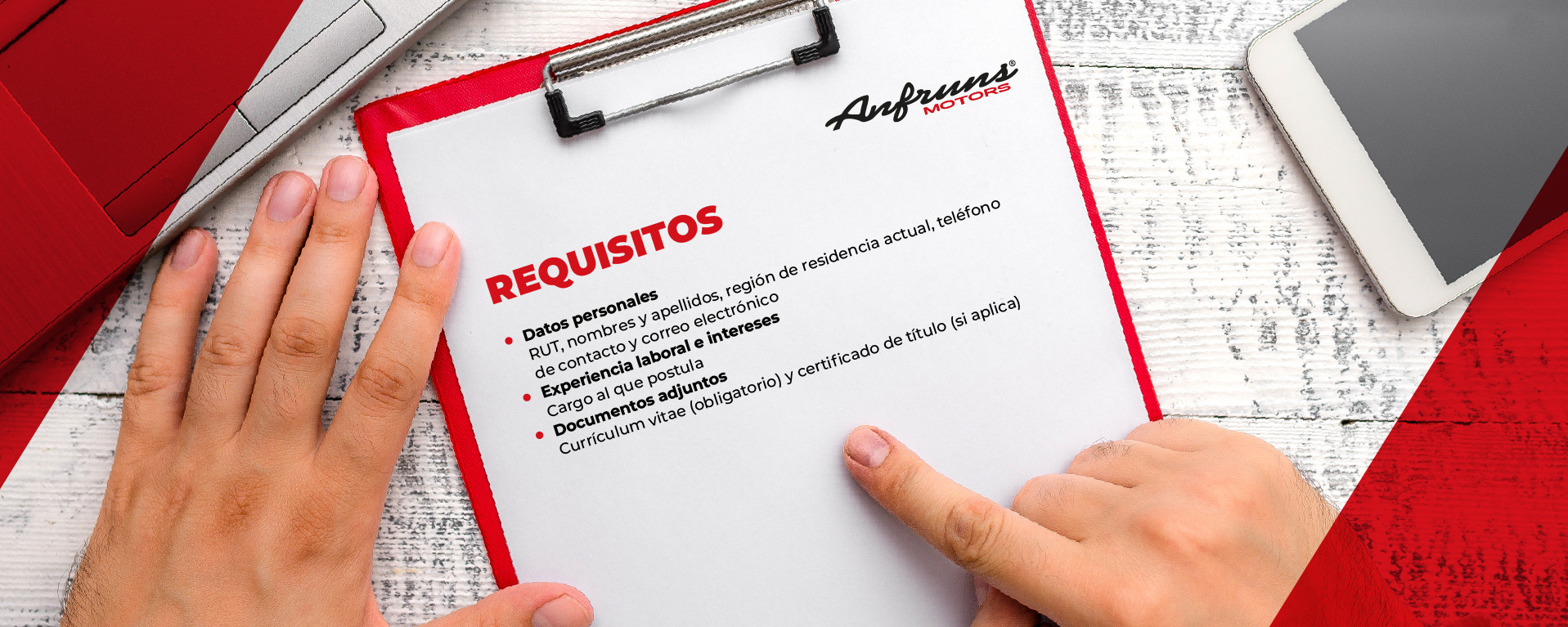 Si estás dispuesto/a a formar parte de esta gran familia postula reclutamiento@anfrunsmotors.cl actualiza tus datos personales y envíanos tu CV a la siguiente dirección: